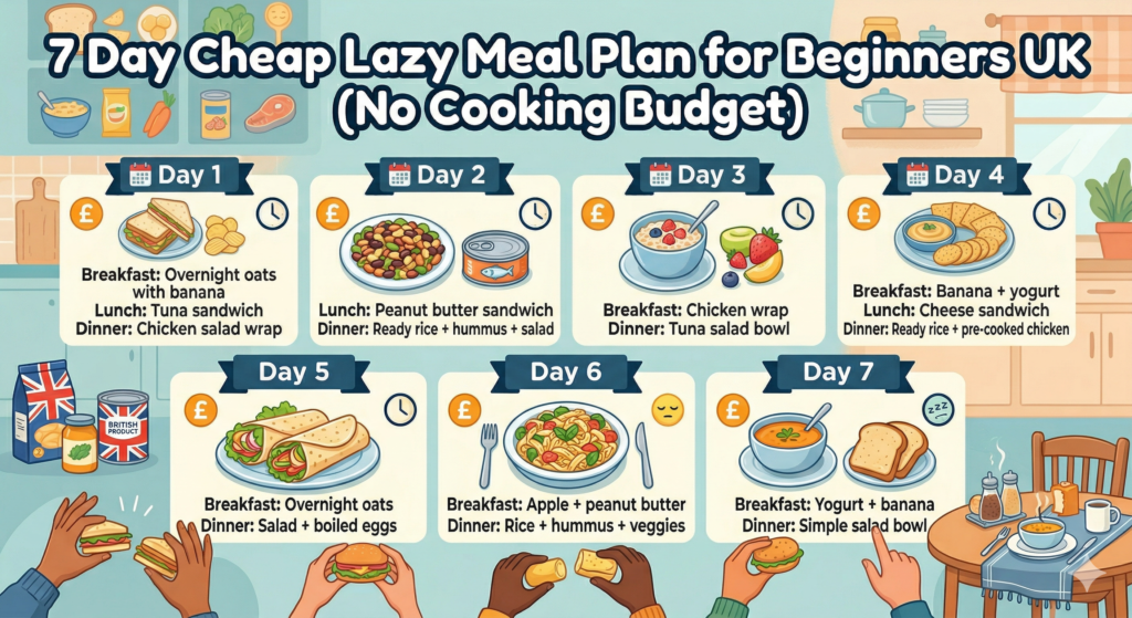 A 7 day cheap lazy meal plan for beginners UK (no cooking budget) is one of the easiest ways to take control of your food spending without sacrificing convenience.